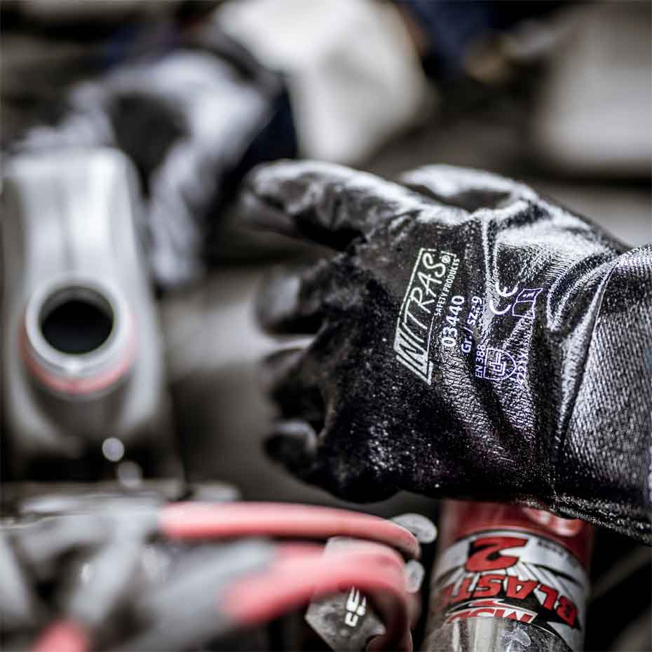 Die NITRAS Nitrilhandschuhe bestehen aus robustem Baumwoll-Jersey und verfügen über eine blaue Nitril-Vollbeschichtung. Sie bieten einen sehr guten Trocken- und Ölgriff sowie eine besonders hohe Abriebfestigkeit.