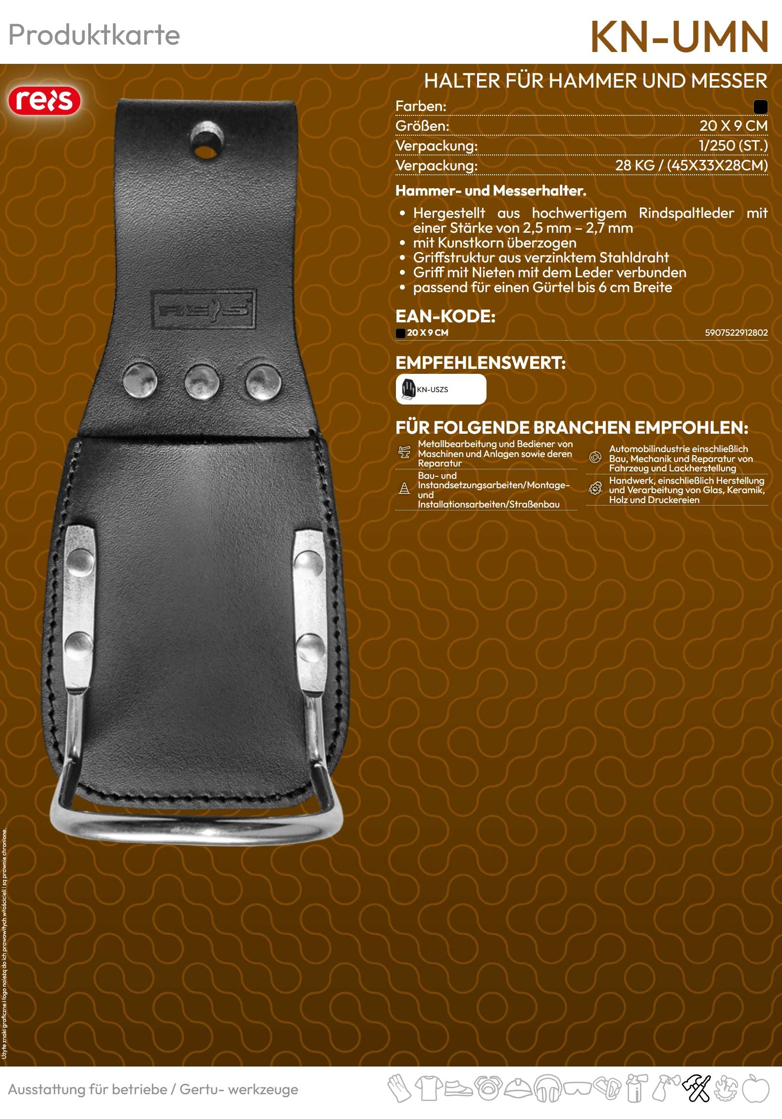 Dieser Hammer- und Messerhalter ist aus hochwertigem Rindspaltleder (2,5–2,7 mm) gefertigt und mit Kunstkorn überzogen. Die Griffstruktur aus verzinktem Stahldraht ist sicher mit dem Leder durch Nieten verbunden, sodass Hammer, Messer und andere Werkzeuge fest gehalten werden.